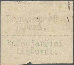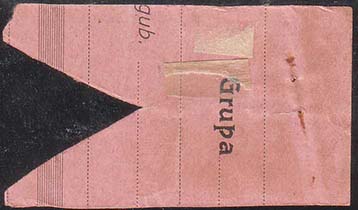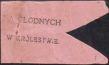1917(?) г. Риньетва в виде флажка разм. 59 х 34 мм с фестончатым вырезом в правой части. Одно-цветная печать на светло-розовой бумаге. В центре текст на польском языке в две строки: «Голодным в Королевстве».