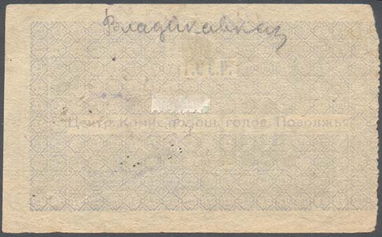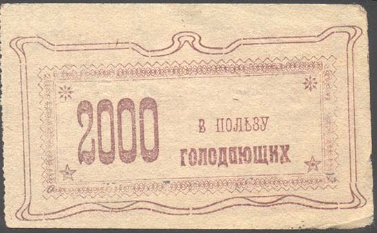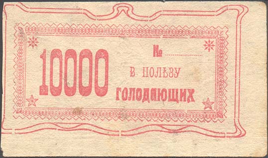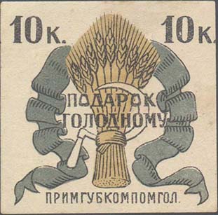 1922 г. Трехцветная печать на белой бумаге. В центре сноп и серп в обрамлении ленты. Текст в две строки: «Подарок голодному». Сверху по углам номинал. Внизу текст: «Примгубкомпомгол».