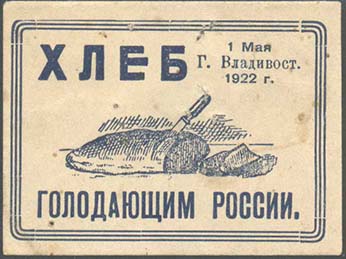 1922 г. 01.05.1922 г. Разм. рамки 53 х 37 мм. Одноцветная печать на белой бумаге. В тройной прямоугольной рамке с закругленными краями в центре на столе батон хлеба с воткнутым ножом и два отрезанных куска. В левом верхнем углу текст: «Хлеб». Внизу продолжение текста: «голодающим России». В правом верхнем углу текст в четыре строки: «1 мая Г. Владивост[ок]. 1922 г.».