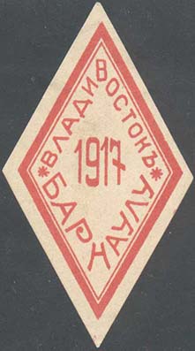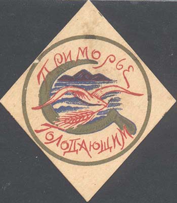 1922(?) г. Ромб разм. 60 х 67 мм. Трехцветная печать на плотной белой бумаге. В центре в круглой рамке диаметром 43 мм серп, колос и вид морского пейзажа с чайкой. Текст: «Приморье голо-дающим».