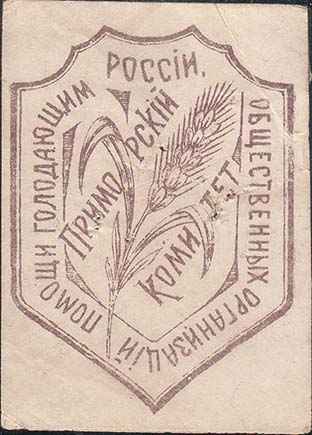 1918(?) г. Разм. 39 Х 54 мм. Одноцветная печать на белой глянцевой бумаге. В центре в двойной рамке в виде щитка сложной формы разм. 36 х 50 мм колос ржи и текст по диагонали в две строки: «Приморский комитет». Между рамками продолжение текста: «Общественных организаций помощи голодающим России».