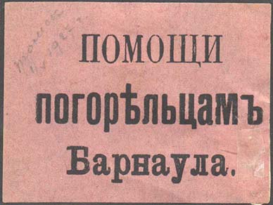 1917 г. Разм. 50 х 56 м. Одноцветная печать на зелено-серой бумаге. В центре текст в три строки: «В пользу погорельцев С.Р. и С.Д.».