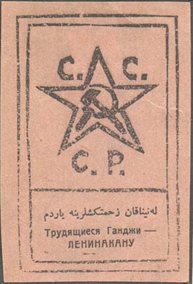 1926(?) г. Разм. 46 х 68 мм. Одноцветная печать розово-серой бумаге. В двойной прямоугольной рамке разм. 39 х 62 мм в центре пятиконечная звезда с серпом и молотом в центре и аббревиатура «С.С.С.Р.». Внизу текст на азербайджанском языке арабской графикой. Внизу текст в две строки: «Трудящиеся Ганджи - Ленинакану».