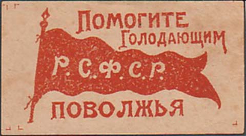 1921 г. Разм. 42 х 78 мм. Одноцветная печать на желтоватой бумаге. В центре знамя с древком. На полотнище аббревиатура «Р.С.Ф.С.Р.». Сверху текст в две строки: «Помогите голодающим». Внизу продолжение текста: «Поволжья».