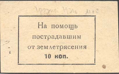 1931 г. Май Разм. 69 х 42 мм. Одноцветная печать на белой бумаге. В прямоугольной рамке разм. 45 х 29 мм текст в четыре строки: «На помощь пострадавшим от землетрясения 10 коп.».