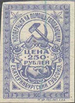 1923 г. Разм. 27 х 37 мм. Одноцветная печать на белой бумаге. В двойной прямоугольной рамке разм. 23 х 33 мм с орнаментом в центре фигурная рамка в виде цифры 8. В центре фигурной рамке картуш с номиналом: «Цена 250 рублей». Сверху серп и молот. Внизу две руки в рукопожатии. На верхней части фигурной рамки текст: «Кооперация на помощь голодающим». На нижней половине фигурной рамки текст: «Екатеринбургский губсоюз». Внизу под рамкой справа мелким шрифтом выходные данные: «2–я Ур. Гос. Лит. Е.К.Б.».