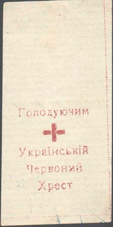 1922 г. Разм. 36 х 74 мм. Одноцветная печать на оборотной стороне белой бумаги. В центре красный крест. Текст в четыре строки на украинском языке: «Голодающим Украинский Красный Крест».