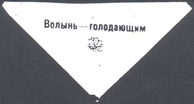 1922(?) г. Виньетка в виде перевернутого треугольника разм. 100 х 52 мм. Одноцветная печать на глянцевой фиолетовой бумаге. В центре текст: «Волынь - голодающим». Ниже растительный орнамент.