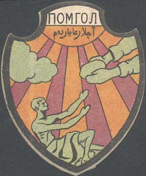 Разм. 52 х 62 мм. В центре на фоне серпа, молота, граблей и колосьев пшеницы в круглой рамке парусная лодка, плывущая по реке на фоне гор. По периметру рамки текст: «Рабочий – голодному крестьянину».