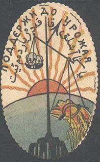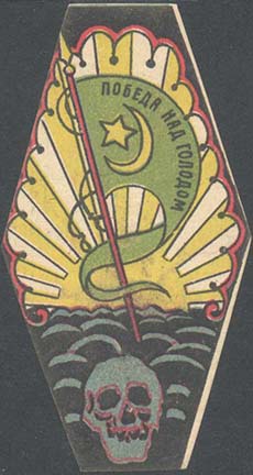 1922 г. Виньетка в форме ромба с усеченными вертикальными углами разм. 40 х 70 мм. Многоцветная печать на плотной белой глянцевой бумаге. В центре аллегорический рисунок, символизирующий победу над голодом: черепа и флаг на фоне восходящего солнца. На полотнище флага текст: «Победа над голодом» и пятиконечная звезда с полумесяцем.