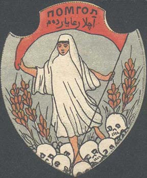 1922 г. Виньетка в виде щитка сложной формы разм. 50 х 60 мм. Трехцветная печать на плотной белой глянцевой бумаге. В центре аллегорический рисунок, символизирующий победу над голодом: черепа и колосья пшеницы по бокам. В центре женщина со знаменем в левой руке. На полотнище знамени текст на русском и татарском (арабской графикой) языках: «Помгол».