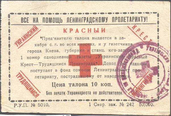 1925 г. Листок из квитанционной книжки разм. рамки 100 х 67 мм. Двухцветная печать на плотной белой бумаге. Левосторонняя зубц. 11 1/2. В прямоугольной декоративной рамке разм. 89 х 52 мм текст в 10 строк: «Предъявителю талона в декабре с. г. во всех киосках и у газетчиков города Киева, губернии и станц[ий]. юго-зап[адной]. ж.д. 1 номер однодневной газеты «Украинский Красный Крест – Трудящимся Ленинграда». Доход от издания поступает в фонд помощи Ленинградскому пролетариату, пострадавшему от наводнения. Цена талона 10 коп. Без печати Украинкреста не действителен». Сверху текст: «Все на помощь Ленинградскому пролетариату!». По углам рамки текст наклонно с подчеркиванием: «Украинский Крест Трудящимся Ленинграда». Внизу под рамкой выходные данные: «Р.У.П. №5010. 1 Скор. зак. №242 50.000». Справа фиолетовый оттиск круглой печати общества.