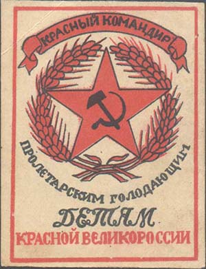 1921 г. Разм. рамки 46 х 53 мм. Двухцветная печать на желтоватой бумаге. В центре пятиконечная звезда с серпом и молотом в центре в обрамлении венка из колосьев. Сверху на ленте текст: «Красный командир». Внизу продолжение текста в три строки: «пролетарским голодающим детям красной Великороссии».