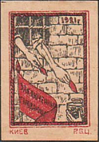 1921 г. Разм. рамки 30 х 44 мм. Двухцветная печать на желтоватой бумаге. В центре в прямоугольной рамке тюремное окно с решеткой, из которого две руки протягивают куски хлеба. В правом верхнем углу дата: «1921 г.». В левом нижнем углу знамя с древком. На полотнище знамени текст: «Заключенные голодающим». Справа внизу под рамкой мелким шрифтом выходные данные: «Киев, Р.Б.Ц.».