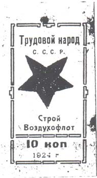 1924 г. Разм. рамки 26 х 48,5 мм. Одноцветная(?) печать на белой(?) бумаге. В центре в прямоугольной рамке перевернутая пятиконечная звезда. Текст в четыре строки: «Трудовой народ С.С.С.Р. Строй Воздухфолот». Ниже под горизонтальной чертой текст в две строки: «10 коп 1924 г.».