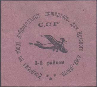 1924(?) г. Разм. 54 х 49 мм. Одноцветная печать на темно-розовой бумаге. В центре самолет-моноплан, летящий вправо. Сверху аббревиатура «С.С.Р.». Внизу текст: «3-й райком». По окружности текст: «Комиссия по сбору добровольных пожертвов[аний]. для Красного возд[ушного]. Флота».