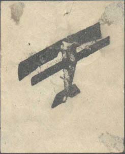 1924(?) г. Разм. 42 х 51 мм. Одноцветная печать на белой бумаге ручным штампом. В центре самолет-биплан, летящий вверх.