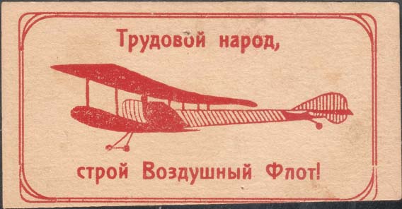 1924(?) г. Разм. 96 х 49 мм. Одноцветная печать на толстой желтоватой бумаге. В прямоугольной рамке разм. 85 х 45 мм с закругленными углами в центре самолет-биплан. Сверху текст: «Трудовой народ,». Внизу продолжение текста: «Строй Воздушный Флот!».
