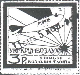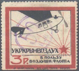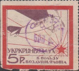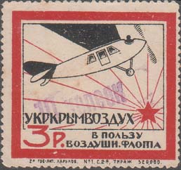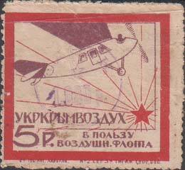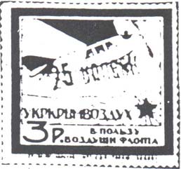 1924 г. Разм. рамки 69 х 48 мм. В двойной прямо-угольной рамке в центре дополнительная двойная овальная рамка. В овальной рамке в центре самолет-моноплан, летящий вправо в лучах восходящего солнца. По периметру между овальными рамками текст: «Помощь Обществу друзей Воздухфлота». По внутренним углам прямоугольной рамки цифры номинала в круглых рамках. Пространство между рамками заполнено фоном из вертикальных штрихов и самолетов. Внизу номинал в виде текста.