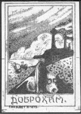 1924(?) г. Разм. рамки 45 х 58 мм. Двухцветная печать низкого качества на желтоватой бумаге. Красноармеец в противогазе со снарядом в руке на фоне клубов дыма. Сверху текст: «ДОБРОХИМ». Под рамкой внизу выходные данные мелким шрифтом данные: «Главлит N 1513».