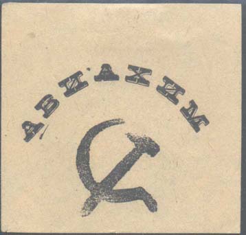 1925(?) г. Разм. 59 х 56 мм. Одноцветная печать на бумаге различных цветов. В центре серп и молот. Сверху полукругом аббревиатура «АВИАХИМ».