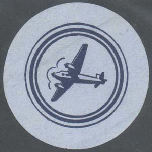 1926(?) г. Круг диаметром 48 мм. Одноцветная печать на голубой бумаге. В тройной круглой рамке самолет, летящий влево.