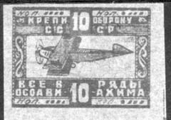 1927 г. Разм. рамки 32 х 24 мм. Одноцветная печать на желтоватой бумаге. В рамке самолет-биплан, летящий влево. Сверху и снизу номинал и текст в четыре строки: «Крепи оборону СССР. Все в ряды ОСОАВИАХИМА».