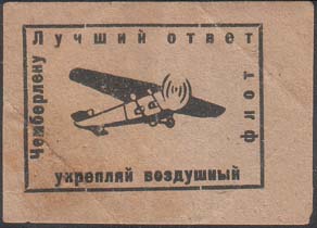 1927(?) г. Разм. 48 х 34 мм. Одноцветная печать на светло-серо-зеленоватой бумаге. В прямоугольной рамке разм. 37 х 26 мм самолет-моноплан, летящий вправо. По внутреннему периметру рамки текст: «Лучший ответ Чемберлену. Укрепляй воздушный флот».