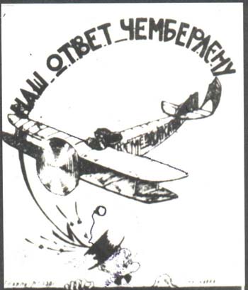 1927(?) г. Разм. 58 х 70 мм. Одноцветная печать на белой бумаге. Аллегорический рисунок: самолет сбрасывает бомбу на голову Чемберлена. Сверху текст: «Наш ответ Чемберлену». Внизу мелким шрифтом выходные данные: «Главлит №3301. Тир. 60000».