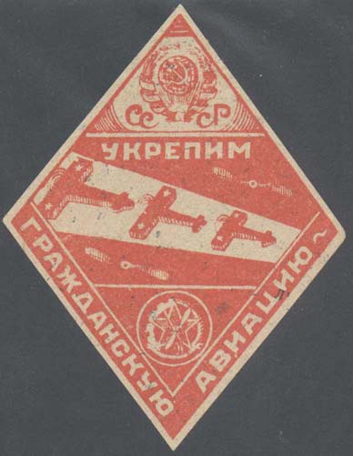 1927(?) г. Ромб разм. 64 х 83 мм. Одноцветная печать на светло-серой бумаге. В ромбовидной рамке в центре три самолета-биплана, летящих влево и два пропеллера. Сверху герб СССР с семью лентами, внизу эмблема ОСОАВИАХИМ. Сверху текст: «Укрепим». Внизу параллельно рамке продолжение текста: «Гражданскую авиацию».