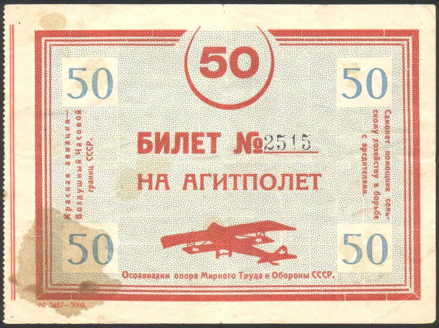 1927(?) г. Квитанция разм. 142 х 104 мм. Двухцветная печать на белой бумаге. Левосторонняя зубц. 11 1/2. В тройной прямоугольной рамке в центре текст в две строки: «Билет № ... на агитполет». Внизу силуэт самолета-биплана. Сверху и по углам номинал. Внизу текст: «Осоавиахим опора Мирного Труда и Обороны СССР». Слева вертикально текст в три строки снизу вверх: «Красная авиация – Воздушный Часовой границ СССР». Справа вертикально текст в три строки сверху вниз: «Самолет помощник сельскому хозяйству в борьбе с вредителями». Слева внизу под рамкой мелким шрифтом выходные данные: «3487-5000».