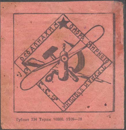 1928 г. Разм. рамки 60 х 58 мм. Одноцветная печать на розово-красной бумаге. В центре в двойной рамке в форме ромба эмблема ОСОАВИАХИМ. По периметру между рамок текст: «ОСОАВИАХИМ опора мирного труда и обороны С.С.С.Р.». Внизу под рамкой мелким шрифтом выходные данные: «Гублит 734. Тираж 10000. 1109-28».