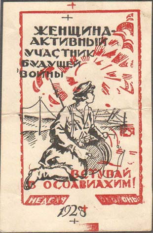 1928 г. Разм. 50 х 74 мм. Двухцветная печать на толстой белой бумаге. Прямоугольная рамка снизу переходит в ленту. На ленте текст: «Неделя обороны». В разрыве ленты дата: «1928». В центре связистка на фоне солнца и облаков. Слева сверху текст в пять строк: «Женщина – активный участник будущей войны». Внизу текст в две строки: «Вступай в ОСОАВИАХИМ!».