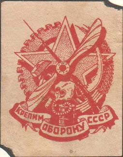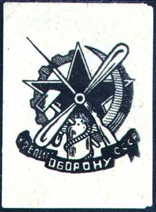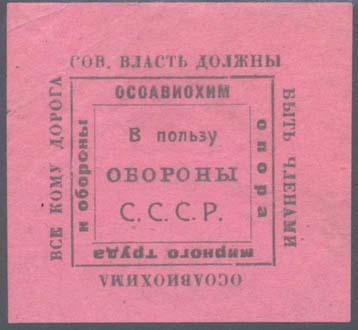 1930(?) г. Разм. 58 х 54 мм. Одноцветная печать на малиновой бумаге. В центре в двойной прямоугольной рамке разм. 34 х 30 мм текст в три строки: «В пользу обороны С.С.С.Р.». По периметру между рамками текст: «Осоавиахим опора мирного труда и обороны». По наружному периметру рамки текст: «Все кому дорога сов[етская]. власть должны быть членами Осоавиахима».