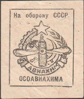 1930 г. Разм 48 х 56 мм. Одноцветная печать на белой бумаге. В центре в прямоугольной рамке разм. 37 х 44 мм эмблема АВИАХИМ. Сверху текст: «На оборону СССР». Внизу аббревиатура «ОСОАВИАХИМА».
