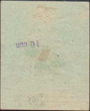 1930(?) г. Разм. 40 х 50 мм. Одноцветная печать на желтоватой бумаге. В центре в прямоугольной рамке разм. 22 х 29 мм эмблема ОСОАВИАХИМ (перевернутая). По углам пятиконечные звезды. По наружному периметру рамки текст: «Создадим мощную противовоздушн[ую]. Оборону СССР. Цена 10 к.». На оборотной стороне фиолетовый оттиск ручного штампа с текстом в две строки: «Крепи Оборону С.С.С.Р.».