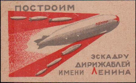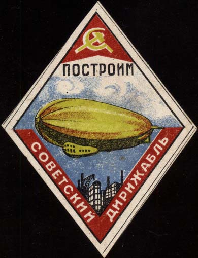 1930(?) г. Ромб разм. рамки 52 х 78 мм. Многоцветная печать на белой бумаге. В рамке в центре дирижабль над заводскими зданиями. Сверху серп и молот. Текст: «Построим советский дирижабль».