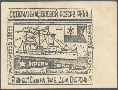 1930(?) г. Разм. рамки 50 х 45 мм. Одноцветная печать на белой бумаге. В центре в двойной прямоугольной рамке военный корабль. В правом верхнем углу военно-морской флаг. Внизу на вымпеле текст: «Крепи оборону страны». Между рамками текст: «Совет ОСОАВИАХИМа Камского бассейна. Я внес 10 коп. на плав[учий]. (плав[ающий].?) дом обороны». Сверху в отдельной рамке текст: «ОСОАВИАХИМ – боевой резерв РККА».