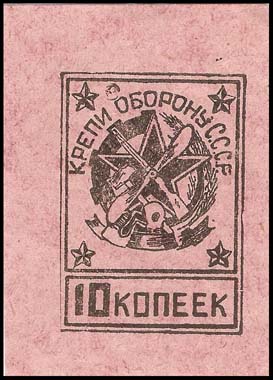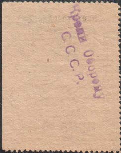 1930(?) г. Разм. 46 х 65 мм. Одноцветная печать на серо-розовой бумаге. В прямоугольной рамке разм. 32 х 45 мм сверху в отдельной прямоугольной рамке эмблема ОСОАВИАХИМа. Сверху полукругом текст: «Крепи оборону С.С.С.Р.». По внутренним углам рамки пятиконечные звезды. Внизу в отдельной прямоугольной рамке номинал.