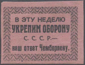 1930(?) г. Разм. рамки 50 х 36 мм. Одноцветная печать на плотной розовой бумаге. В декоративной прямоугольной рамке текст в четыре строки: «В эту неделю укрепим оборону С.С.С.Р. - наш ответ Чемберлену».
