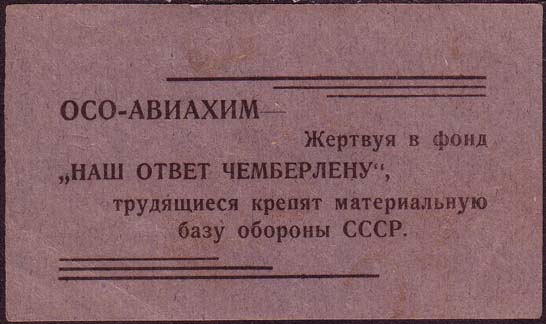 4487(?) г. 1930 Разм. 91 х 53 мм. Одноцветная печать на серо-синей бумаге. В правом верхнем и в левом нижнем углах имитация рамки в виде трех горизонтальных линий различной длины. В центре текст пять строк: «ОСО-АВИАХИМ – Жертвуя в фонд «Наш ответ Чемберлену» трудящиеся крепят материальную базу обороны СССР».