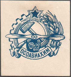 1930(?) г. Разм. рамки 29,5 х 45,5 мм. Двухцветная печать на белой бумаге. В двойной прямоугольной рамке в центре эмблема ОСОАВИАХИМ. По углам рамки пятиконечные звезды.