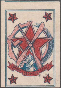 1933(?) г. Разм. 59 х 68 мм. Одноцветная печать на красно-фиолетовой бумаге. Сверху пятиконечная звезда. Ниже текст в три строки: «Крепи оборону С.С.С.Р.».