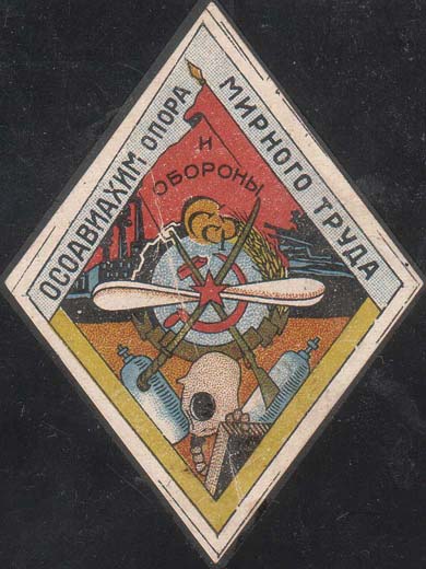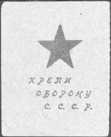 1930(?) г. Разм. 58 х 58 мм. Одноцветная печать на желтоватой бумаге. В центре в круглой раке диаметром 53 мм мишень, в центре которой скрещенные пропеллер, винтовка и баллон с газом. Сверху пятиконечная звезда. Внизу лавровые ветви и текст: «Крепи оборону». По углам знака разграничительные линии.
