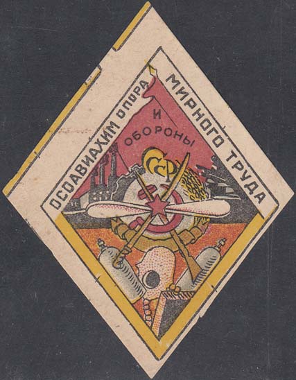 1930(?) г. Ромб разм. 65 х 87 мм. Многоцветная печать на желтоватой бумаге с мелованным верхним слоем. В рамке в форме ромба разм. 59 х 82 мм на фоне индустриального пейзажа в центре стилизованная эмблема ОСОАВИАХИМ. Внизу два газовых баллона и противогаз. Сверху по внутреннему периметру рамки текст: «ОСОАВИАХИМ опора мирного труда». Ниже на полотнище красного знамени продолжение текста в три строки: «И обороны СССР». По углам разграничительные линии.