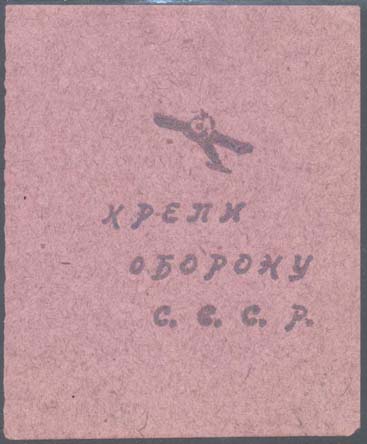 1933(?) г. Разм. 61 х 75 мм. Одноцветная печать на розовой бумаге с темными вкраплениями. Сверху силуэт самолета-моноплана. Внизу текст в три строки: «Крепи оборону С.С.С.Р.».