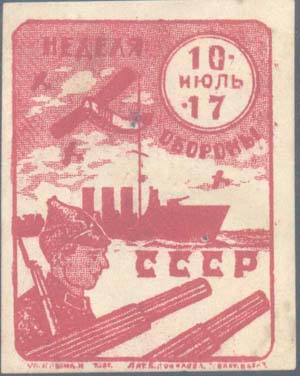 1933(?) г. Разм. рамки 44 х 57 мм. Одноцветная печать на белой бумаге. В рамке с закругленными краями в центре красноармеец с винтовкой, стволы орудий и эсминец. В небе четыре самолета. В правом верхнем углу в двойной круглой рамке дата: «10-17 Июль». Текст в три строки: «Неделя обороны СССР». Внизу под рамкой мелким шрифтом неразборчиво выходные данные.
