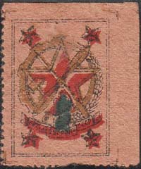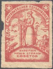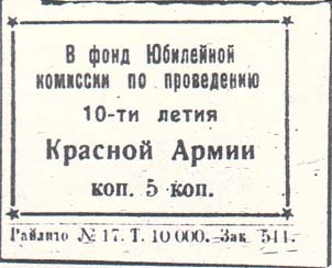 1927 г. Одноцветная печать на бумаге различных цветов и качества. В прямоугольной рамке разм. 43 х 29 мм с декоративными элементами в виде звездочек по углам в центре текст в четыре строки: «В фонд Юбилейной комиссии по проведению 10-летия Красной Армии». Ниже номинал. Внизу под рамкой мелким шрифтом выходные данные: «Райлито №17. Т.10000. Зак. 511».