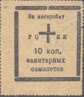 1930(?) г. Разм. рамки 36 х 41 мм. Одноцветная печать на желтоватой бумаге низкого качества. Зубц. 11. В центре эмблема Красного Креста и аббревиатура «РОКК». Ниже номинал. Сверху текст: «На постройку». Внизу продолжение текста в две строки: «Санитарных самолетов». На обороте фрагмент синего оттиска круглой контрольной печати с неразборчивым текстом.
