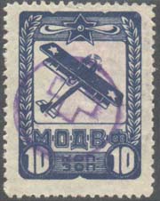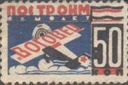 1926(?) г. Разм. 28 х 16 мм. Трехцветная печать на белой бумаге. Зубц. 11 1/2. В центре самолет-биплан, летящий в облаках налево. Сверху текст в две строки: «Построим самолет». На крыльях самолета продолжение текста: «ВОГОВЕЦ». В левом нижнем углу номинал.